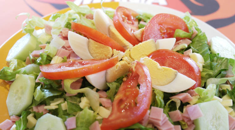 El jamón cocido y el queso lo cortamos en cuadraditos de muy reducido tamaño. El tomate en medias rodajas, en forma de lunas, al igual que el huevo que hayamos cocido. El pepino en rodajas. Se irán colocando encima de la lechuga en función de lo que queramos añadir (maíz, zanahoria rayada, tomates cherry, calabacín, frutos secos, piña,....).
