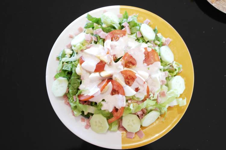 Nosotros la hemos dejada tal cual, con un chorrito de aceite, vinagre y sal. En la segunda foto hemos puesto una cucharada de mayonesa en el centro que se esparce hacia afuera sin llegar al extremo externo del plato.