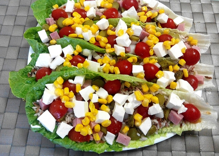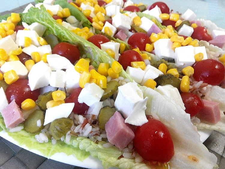 Se pica la media cebolla muy menuda y se echa encima del arroz y ya, posteriormente, por encima se pone el maiz dulce, cherrys que tiran a sabor dulce y jamón cocido, terminando con los pepinillos agridulces encima de todo. Se le añade un poco de sal, vinagre (una gotita) y aceite y podréis comprobar que los contrastes de acido-duce-amargo dan un sabor muy rico e esta ensalada en barca.