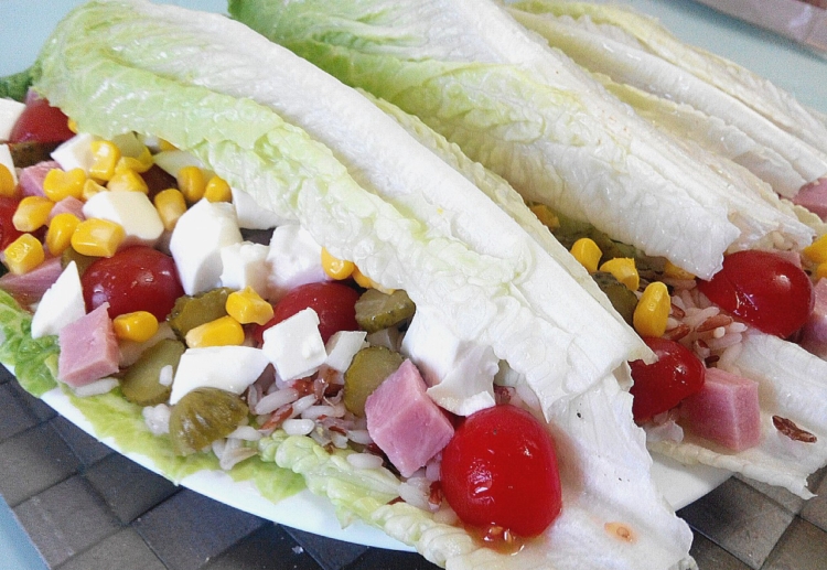 Ensalada en barca. Se trata de una ensalada típica del calor en la que empleamos hojas de lechuga romana como barcas como podéis ver en la foto, lo cual, además de darle una mayor vistosidad, permite individualizar cada baraca para un comensal y ponerla en su cubierto y comerla tal cual o para acompañar a cualquier otra cosa. Incluso, si queréis darle un toque sorpresa, podéis cubrirlas con otras hojas de lechuga por encima como podéis ver en la última foto.