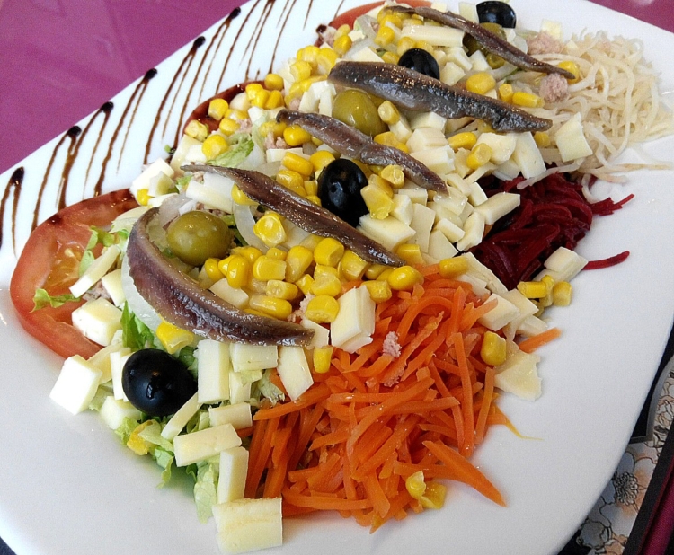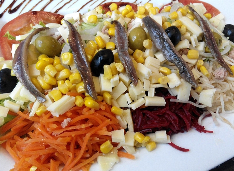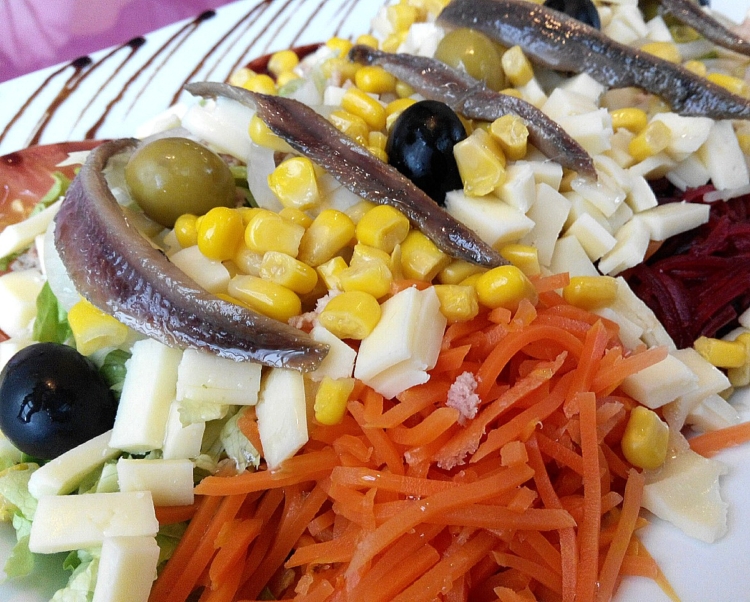 Disponemos en horizontal cinco anchoas y entre ellas alternamos aceitunas verdes y negras y ya solo nos queda aliñarla al gusto: vinagre de vino de Jerez, aceite de oliva y sal al gusto.