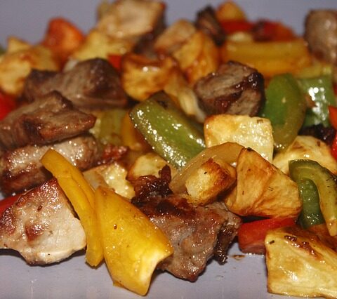 Hay a quien no le gusta el pimiento de esta forma, con lo cual aconsejamos cambiar los tomates cherry y el pimiento por tomate grande de ensalada cortado en rodajas.