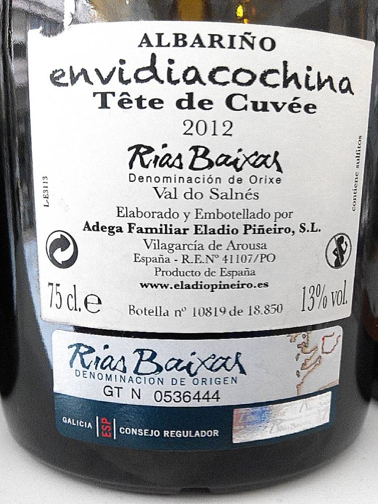 Con este curioso nombre nos encontramos un albariño de una excelente añada como fue al del 2012 en esta D.O. Rías Baixas. Envidiacochina - Tête de cuvée 2012, es un vino elaborado por Adega Familiar Eladio Piñeiro en la comarca del Val do Salnés, de viñas de edades superiores a los 30 años con varietal 100% Albariño.