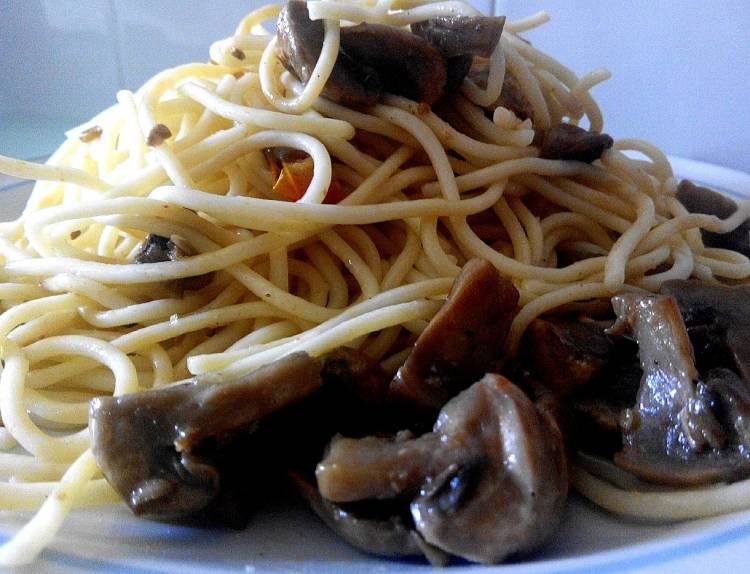 Espagueti con champiñones, ajos y tomates cherry fritos