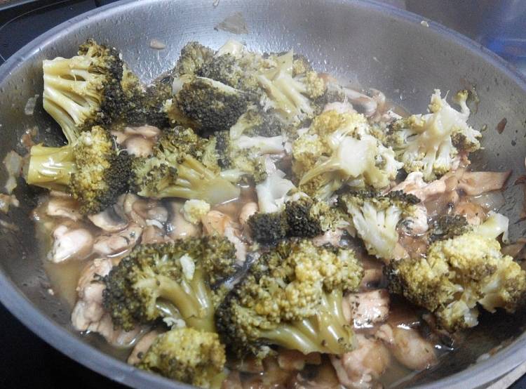 En una sartén echamos 3 cucharadas de aceite y ponemos la media cebolla cortada en tiras finas y el ajo laminado. Los filetes de las pechuga de pollo los cortaremos en trozos rectangulares de tamaño similar y salpimentamos y espolvoreamos con algo de perejil. Los ponemos en la sartén y los doramos por todos los lados para, a continuación, echar los champiñones laminados muy finos. Cuando estén todos dorados echamos una cucharada de aceite de soja y revolvemos y esperamos dos minutos para echar el vino. Tapamos y dejamos cocer a fuego lento para que se reduzca el alcohol del vino. Cuando se haya evaporado echamos el brócoli en trozos y revolvemos para que se junten los sabores.