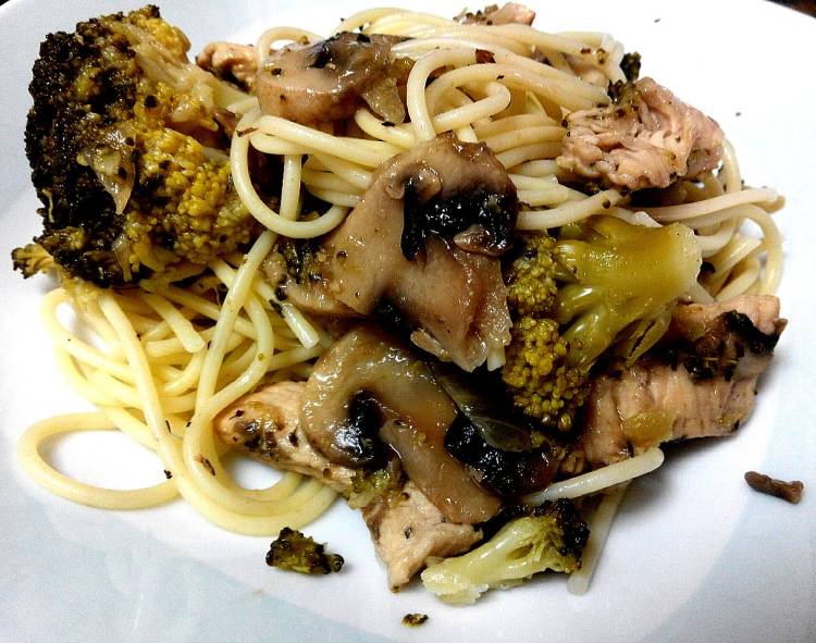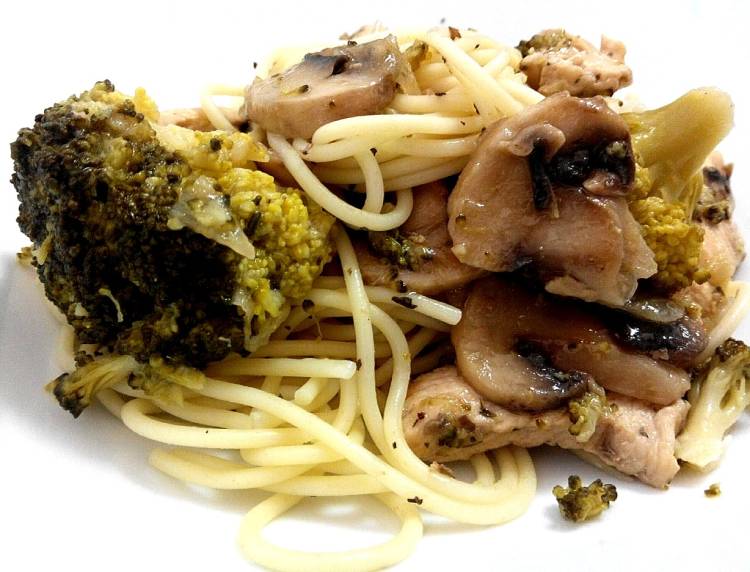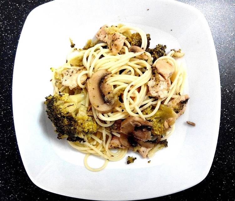 Espagueti con pollo y verduras al vino blanco