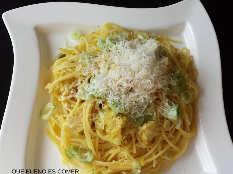 Hoy para la cena nos recomienda nuestro amigo Sergio este plato de pasta, unos Espaguetis con pavo al curry, con lo cual nos da que os va a gustar mucho, pero que conviene no abusar ya que estamos ante una receta con hidratos de carbono.
