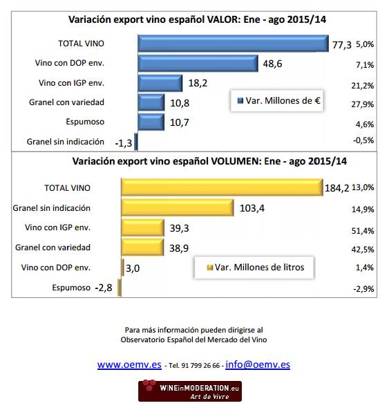 La buena marcha en valor de los vinos con denominación de origen que suben en 48,6 millones de euros, permite a España aumentar sus exportaciones de vino un 5% en valor, hasta los 1.636 millones de euros, con incremento de 77,3 millones respecto al mismo período del año anterior.