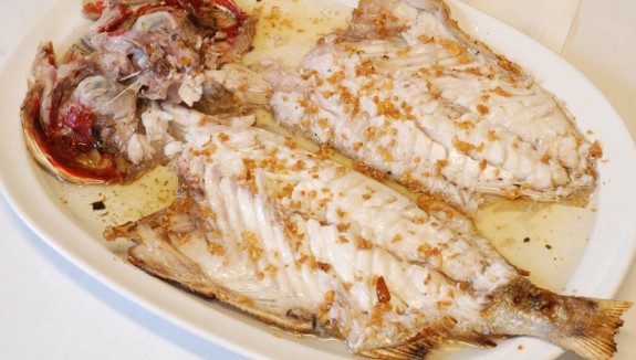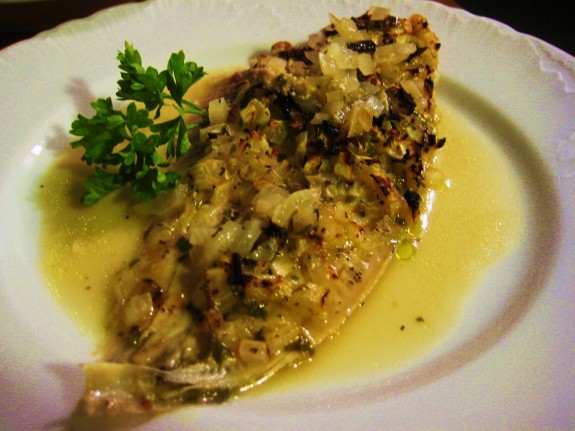 Filetes de lenguado al horno con vino blanco y picadito de cebolla