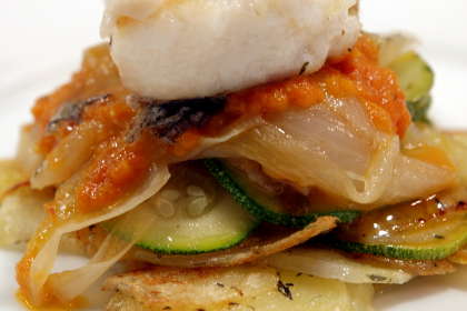 Milhojas de merluza aromatizada con aceite de orégano y aliño balsámico