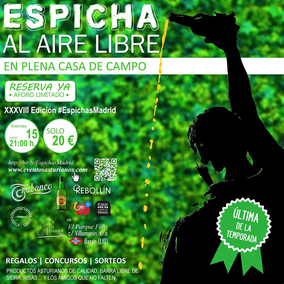 Nuestros amigos de Eventos Asturianos están organizando la última ESPICHA AL AIRE LIBRE de la temporada. La cita será el próximo viernes 15 de julio, a las 9 de la noche, como viene siendo habitual. Es en concreto la edición XXXVIII de #EspichasMadrid. Los asistentes a ediciones anteriores ya conocen a la perfección lo que les espera en esta Espicha al Aire Libre.