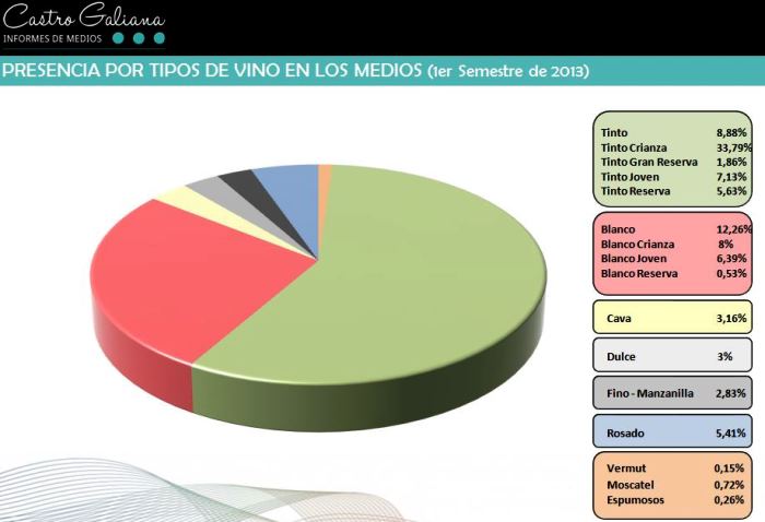 El 57% de la atención de los medios se destina a comentar los vinos tintos y el 34% se lo lleva en exclusiva el tinto crianza, que es el vino "rey" de los medios. Los vinos blancos ocupan algo más del 27% de todos los contenidos.