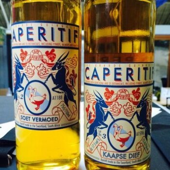 AA Badenhorst - Caperitif. La inicial etiqueta de la izquierda subtitulaba 'Soet Vermoed' (vermut dulce) en afrikaans se traduce directamente como "sospechoso dulce", malo para la exportación de vinos con lo que se decidió cambiar en la segunda por 'Kaapse Dief' que en la propia web de la compañía se explica que no significa nada, solo que se parece al nombre en la pronunciación, que no hay ningún doble sentido.