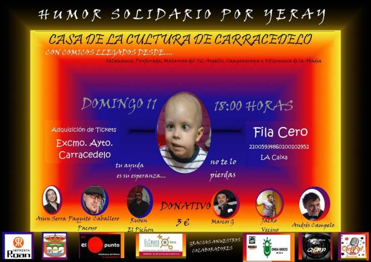 La Casa de la Cultura de Carracedelo recibirá este próximo domingo 11 a las seis de la tarde acogerá una gala de humor solidario para recaudar fondos para ayudar a la familia del niño Yeray Garrido con los costes del tratamiento necesario para luchar contra el cáncer que padece.