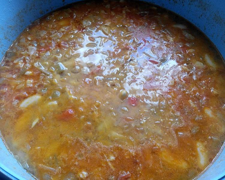 El la sartén echamos las migas de bacalao bien escurridas y las mezclamos con el pisto un par de minutos solamente, momento en el cual echaremos todo el contenido de la sartén en la olla de las fabes, revolvemos y ponemos a fuego medio-tirando a bajo unos 10 minutos para que se mezclen bien los sabores.