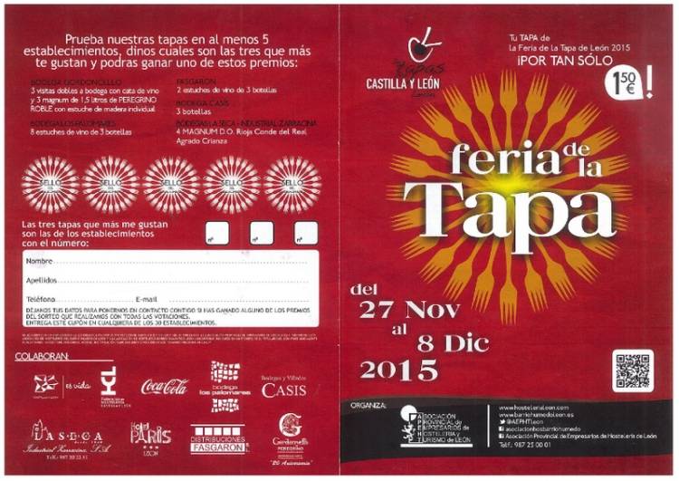 Otra propuesta que tenemos para este fin de semana, es la Feria de la Tapa de León 2015 que dio inicio el fin de semana pasado y que se prolonga hasta el próximo día 8 de este mes de diciembre. 30 establecimientos de la capital y de la provincia se han unido a esta feria que como novedad en esta edición es que habrá un concurso de fotografía, donde se debe hacer una foto de la tapa con una botella de Coca-Cola indicando el nombre del local donde te encuentras. La organización la sube al Facebook del evento y la más compartida y que más guste tendrá premio, además de otro que facilita el promotor a las 10 que reciban más me gustas en esta red social.