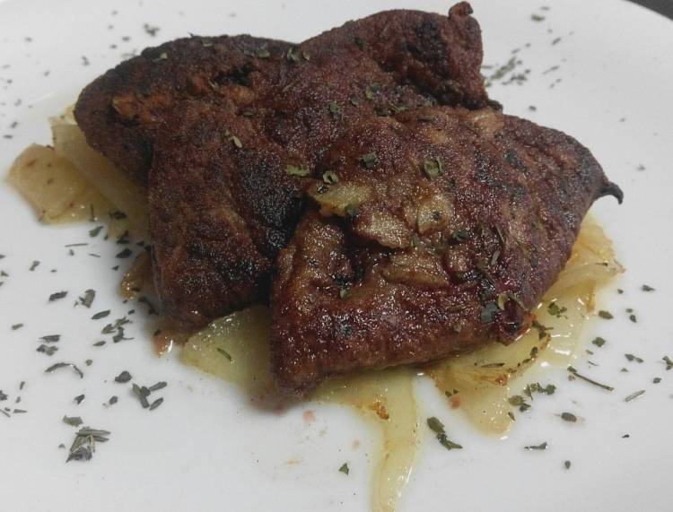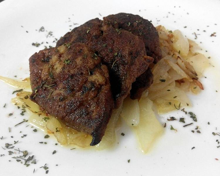 Filetes de hígado de ternera encebollados al vino blanco