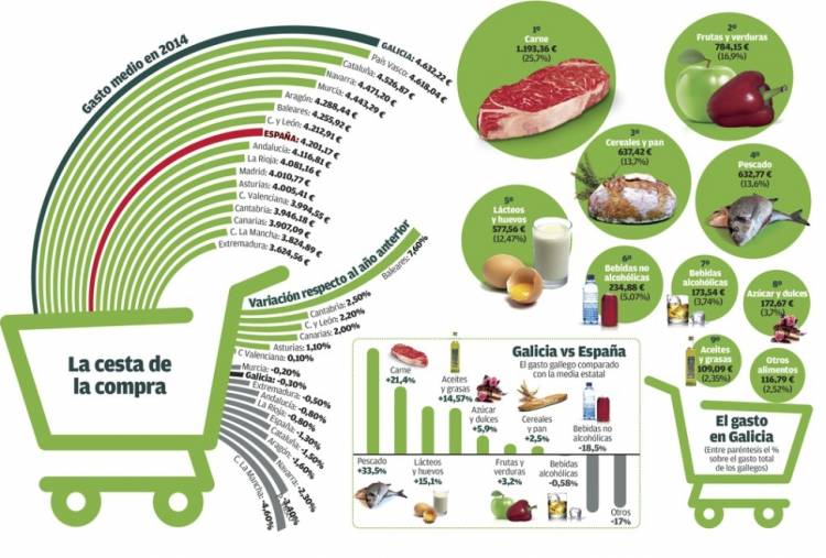 Galicia con 4.632,22 euros, 431,05 euros más que la media nacional y mil euros por encima de lo que dedican los extremeños, seguida de País Vasco 4.618,04 euros y 4.526,87 euros de Cataluña, son las tres comunidades autónomas que más gastan en la cesta de la compra anualmente. Lo más curioso es que Galicia es la segunda comunidad de España con menor pensión media y está a la cola en las qdel salario medio por ciudadano.