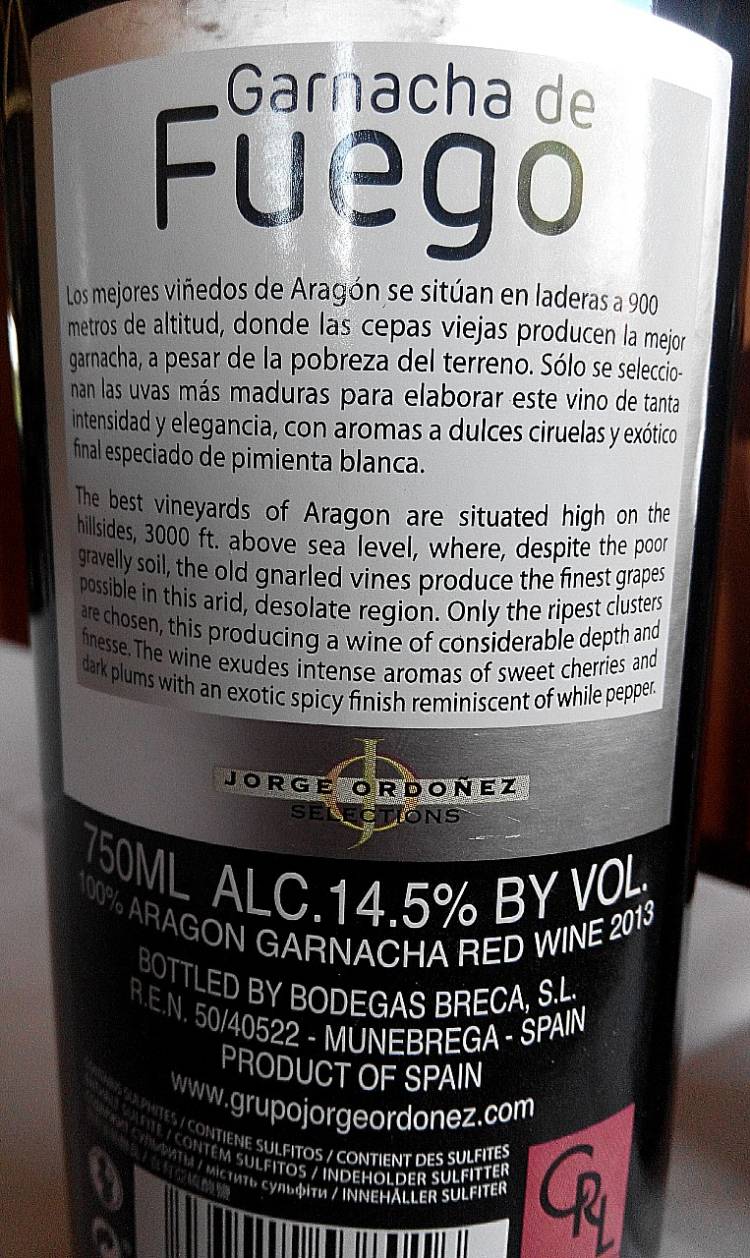 Garnacha de Fuego 2013, es un monovarietal 100% Garnacha procedentes de viñas viejas con lo cual le confiere una complejidad muy apetecible. Vino perteneciente a la D.O. Calatayud que es elaborado por Bodegas Jorge Ordoñez.
