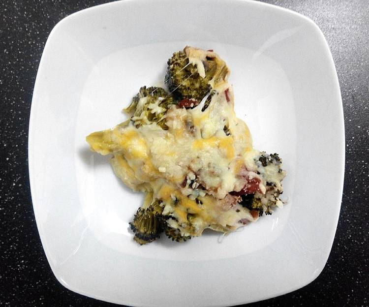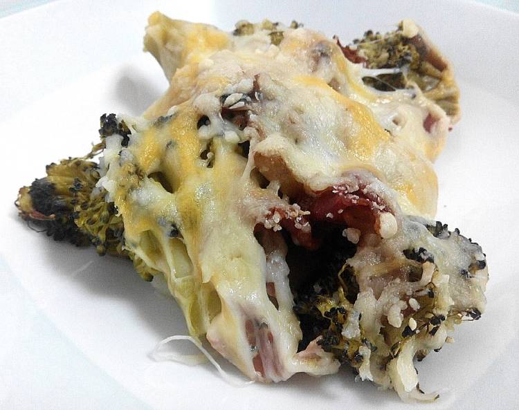 Gratinado de brócoli con tiras de ibérico y champiñones en una bechamel ligera