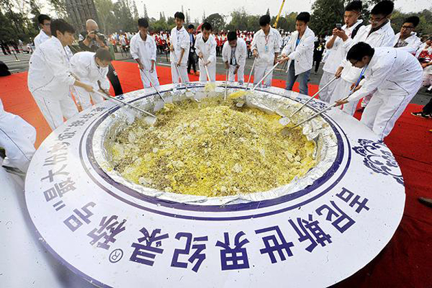 Yangzhou da nombre al plato que en Occidente se conoce comúnmente como “arroz tres delicias”, frito y con gran variedad de ingredientes salteados, por lo que autoridades de la ciudad creyeron que la mejor forma de promocionarla era cocinar una versión gigante de la principal contribución local a la gastronomía china.