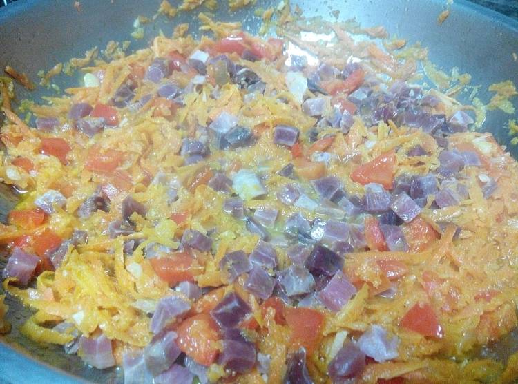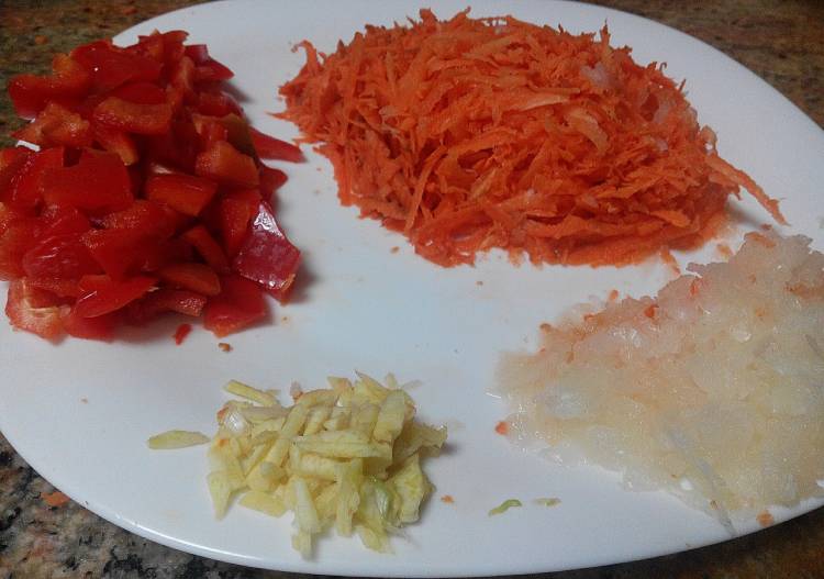 Cortamos en taquitos el jamón y en trozos irregulares pero de similar tamaño el chorizo. Muy picado el diente de ajo, rallamos las zanahorias en tiras finas y rayamos en los agujeros más pequeños la cebolla, porque queremos que suelte todo su líquido y quedarnos exclusivamente con la cebolla. El pimiento en trozo más o menos de 1 centímetro.