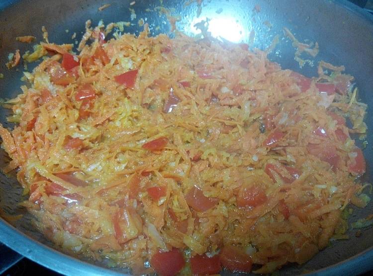 Ponemos en una olla estilo paellero dos cucharadas de aceite de oliva y lo primero que echamos es la cebolla y el ajo para que se empiecen a hacer. la cebolla soltará líquido, muy poco, con lo cual no echamos más aceite. Cuando empiece a hacerse, echamos la zanahorias, revolvemos y en un minuto el pimiento y volvemos a revolver. Bajamos el fuego al medio y revolvemos unos 2 minutos todo. Es el momento de ver que casi no nos queda aceite, con lo cual echamos medio vaso de vino blanco y tapamos hasta que se evapore.