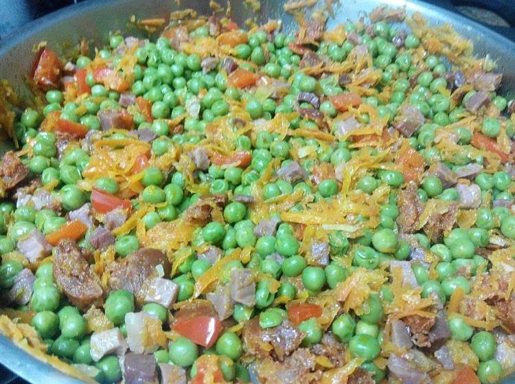 Finalmente añadimos el chorizo. Lo dejamos para el final porque es el que más sabor suele dar (dependiendo del chorizo claro está). Revolvemos todo y ya solo nos queda poner los guisantes. Ya véis que nos ha quedado una buena olla para seis comensales.