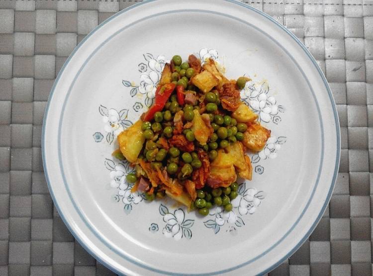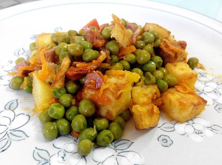 Una de esas recetas que es muy famoso y conocida es la de guisantes con jamón. Pero me acuerdo que mi abuelo además siempre quería que le echasen un par de chorizos caseros ahumados, porque decía que le daba otro sabor. Y la verdad es que razón llevaba. Por eso esta receta de Guisantes del abuelo, la podemos considerar como una ampliación de la clásica de guisantes con jamón ya que lleva ambas cosas y rematamos el plato friendo unas patatas fritas en cuadraditos y poniéndolas por encima.