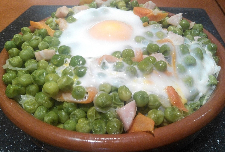 Cogemos un cuenco de barro y ponemos nuestros guisantes. Batimos uno de los huevos y lo echamos por encima para que entre bien por todas partes. El otro lo abrimos y lo ponemos encima. Metemos el plato en el microhondas y lo ponemos a calentar hasta que veamos que la clara empieza a coger color blanco. Sacamos del micro para que al pinchar el huevo es esparza por encima.