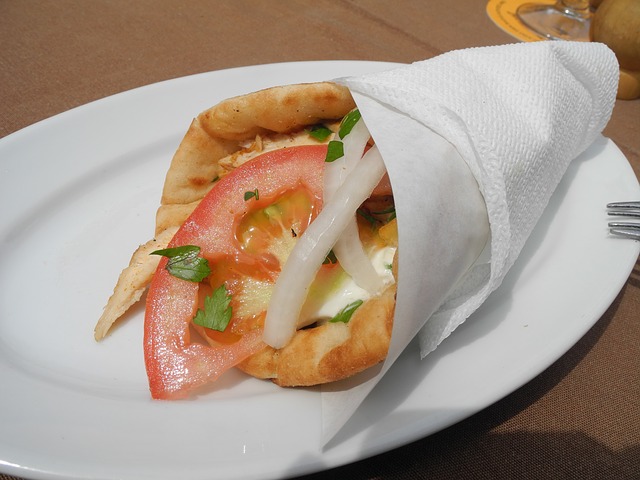 Primero se cocina en un asador vertical y luego se corta en trozos pequeños que se colocan dentro de un pan como el que os comentábamos acompañado de cebolla, tomate y una salsa llamada tzatsiki, la cual se