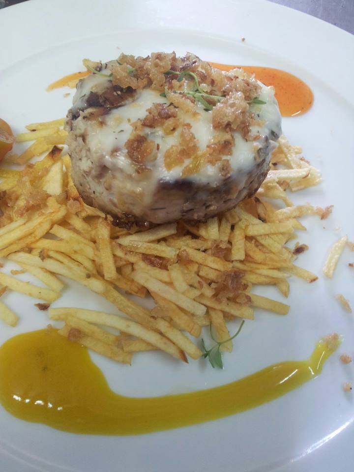 Hamburguesa de bonito, mozzarella, oregano con patatas paja
