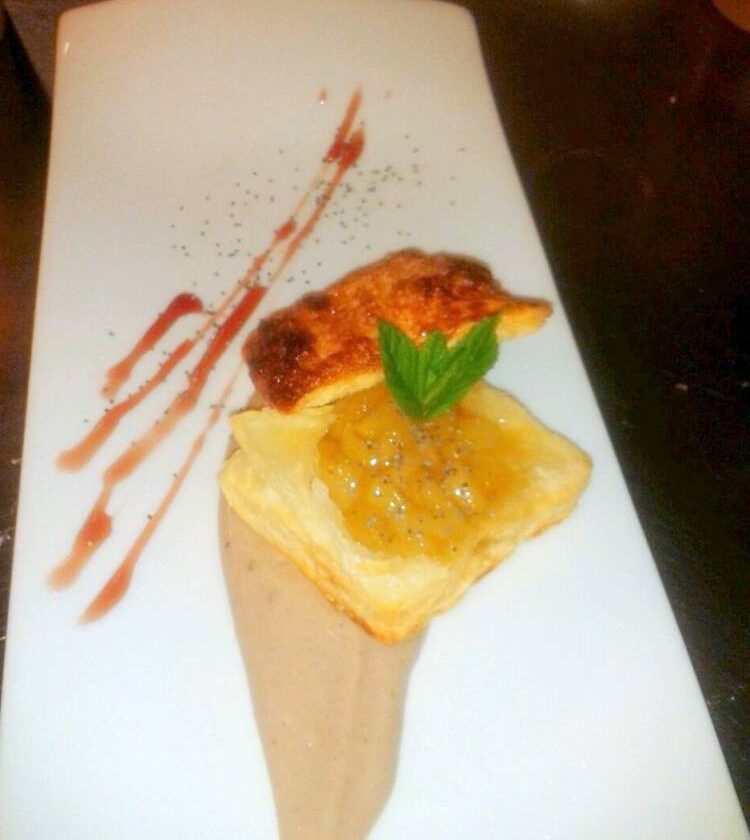 Para montar nuestro delicioso plato colocaremos una lagrima de la crema de castañas que podrá estar fria o caliente a vuestro gusto, ponemos la parte inferior de la milhoja y rellenamos con la pera caramelizada, ponemos de medio lado la tapa de hojaldre y decoramos con alguna hoja fresca.