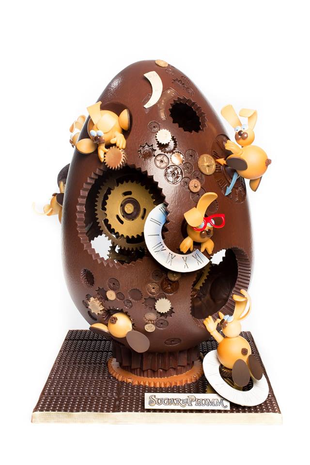 El huevo tiene un tema: Se ha tallado con relojes de chocolate con oro comestible y todo alrededor de esos relojes son conejitos.