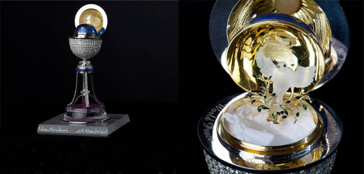 Al abrirlo podemos observar una especia de esfera de oro hecha a mano de 18 quilates, bañada en un color azul intenso. Dentro de esta esfera encontramos una paloma de cristal, la cual tiene su pico hecho de oro y sus ojos de piedras preciosas.