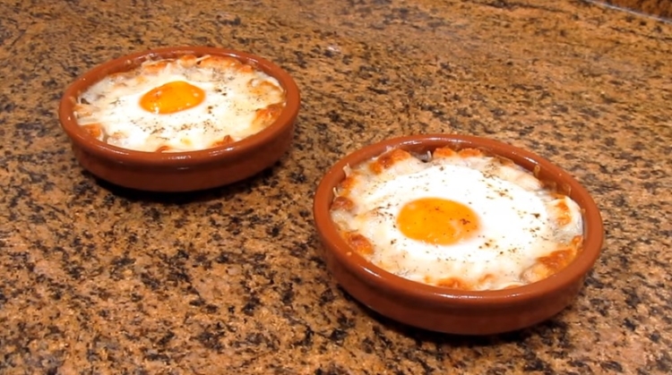 Se reparte el contenido de la sartén en dos recipientes de horno, ideal cuencos de barro que habremos untado con aceite previamente para ayudar a desmoldarlos. Poenmos la mitad del pan que teníamos en el horno en cada uno y se cubren de queso, dejando en el medio un pequeño hueco para poner un huevo al que echamos un poco de sal y pimienta y metemos en el horno a 180º. Lo dejaremos al gusto de cada uno (máximo 15 min.)