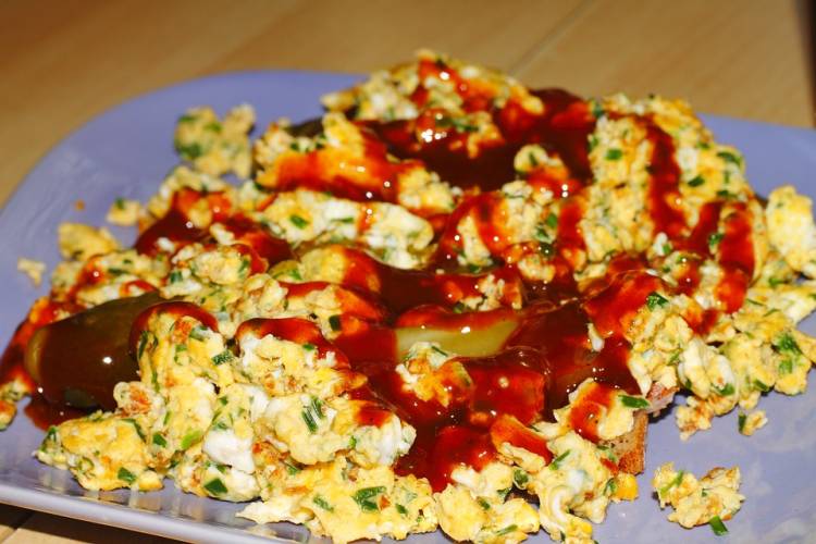 Lo ideal es que se haga todo exactamente igual y, sobre todo, evitar que alguna de las partes se queme y otras queden crudas. Se saca de la sartén y se pone sobre la tostada de pan. Y ahora, de forma opcional y para gustos, se le puede echar una curiosa cantidad de ketchup que le dará mucho sabor y colorido.