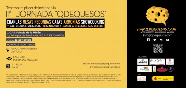 IIª Jornada Q de Quesos. Un año más Q de Quesos se celebrará en el “Palacio de la Misión” ubicado en Casa de Campo, y consistirá en una jornada durante la cual 25 queserías presentarán sus productos en stands o zonas de degustación a un público especializado.