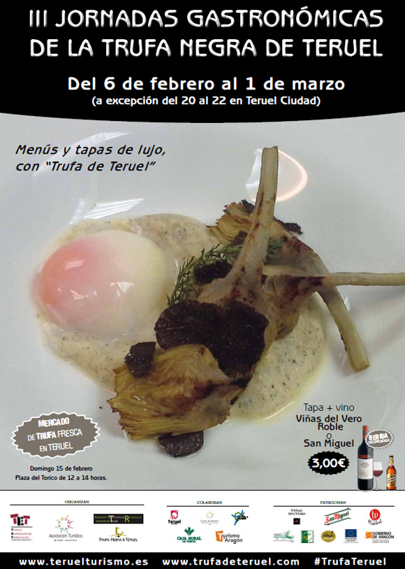 Este fin de semana ha dado comienzo las III Jornadas Gastronómicas de la Trufa de Teruel que desde el pasado viernes y hasta el próximo día 1 de marzo, harán las delicias gastronómicas de los que se acerquen a alguno de los 52 establecimientos en todo la provincia que participan en estas jornadas gastronómicas en las que se ofrecen más de 150 propuestas diferentes elaboradas con trufas aptas para todos los bolsillos ya que nos encontramos con tapas por 2 euros y con menús más elaborados a partir de 30 euros. Muchos de las tapas y menús son aptas para celíacos.