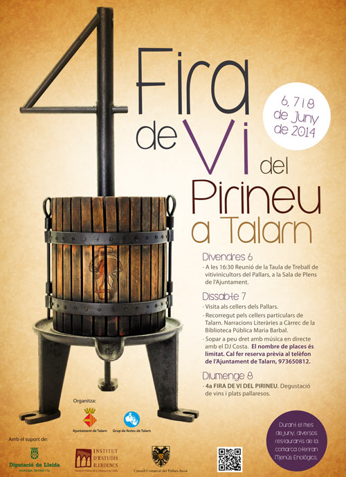 El vino de la comarca del Pallars protagonizará la cuarta edición de la Fira del Vi dels Pirineus que se celebrará en el municipio de Talarn, Pirineo de Lleida.