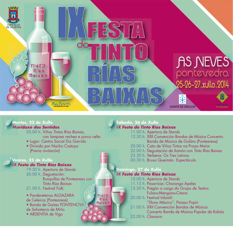 Se celebrará entre el 25 y 27 de este mes la IX Festa do Tinto Rías Baixas en la localidad de As Neves, aunque el día 22 ya se celebrará alguna actividad como podéis ver en el programa de la feria.