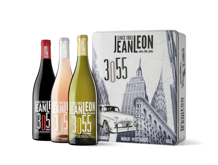 El estuche contiene los tres vinos de la gama 3055: Chardonnay, Rosé Pinot Noir y Merlot · Petit Verdot y está ilustrado con imágenes del Nueva York de los años 50, época en la que Jean Leon desembarcó en la ciudad de los skylines con tan sólo 19 años y una maleta llena de sueños e ilusiones. Uno de sus primeros trabajos fue el de taxista y es precisamente el número de su licencia el que da nombre a esta gama de vinos, rindiendo homenaje a sus inicios en tierra americana.