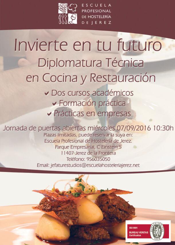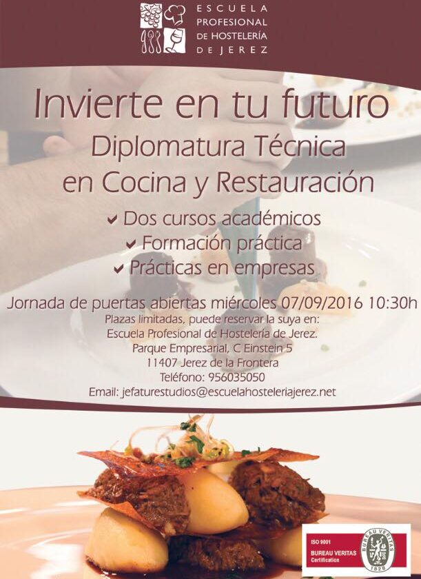 La Diplomatura Técnica en Cocina y Restauración es un título propio de la Escuela de Hostelería de Jerez. Consta de dos cursos lectivos con un total de 2.000 horas de formación dual. Esto es, con aproximadamente un 30% de contenidos puramente teóricos y un 60 de prácticas profesionales en empresas.