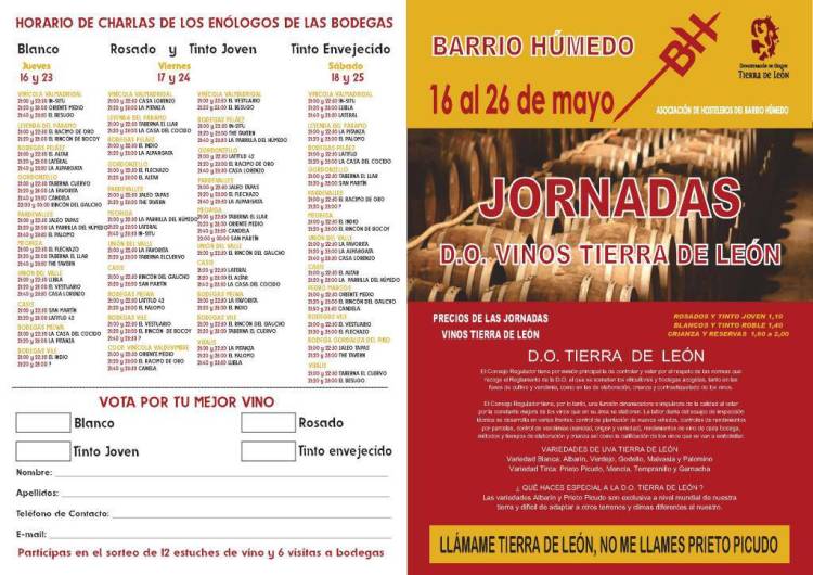 Desde el pasado jueves y hasta el próximo día 26 de este mes de mayo, en al Barrio Húmedo de Léon, centro neurálgico del tapeo de la ciudad y de toda la provincia, se van a celebrar las Jornadas D.O. Vinos Tierra de León como podéis ver en el impreso que os adjuntamos.