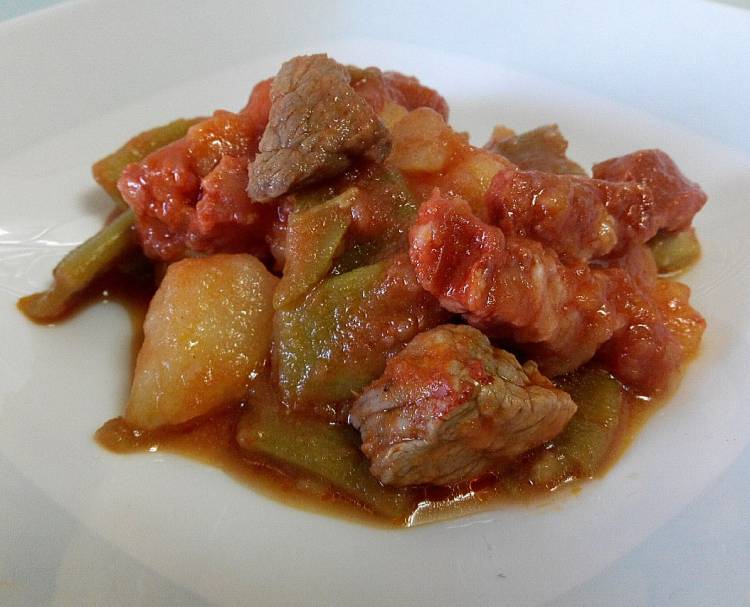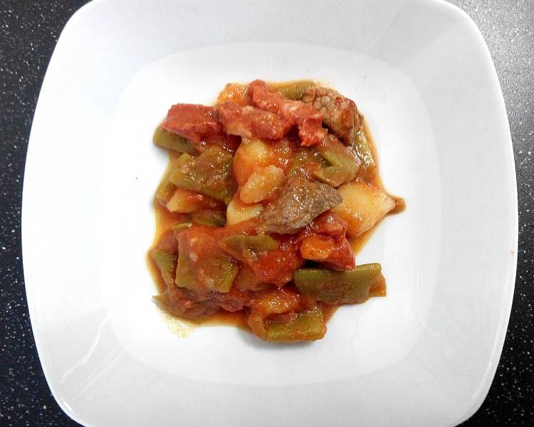 Escurrimos las judías y las patatas y las vamos incorporando a la cazuela donde tenemos la salsa de tomate completita. Revolvemos todo y dejamos 5 minutos a fuego bajo que se mezclen los sabores.