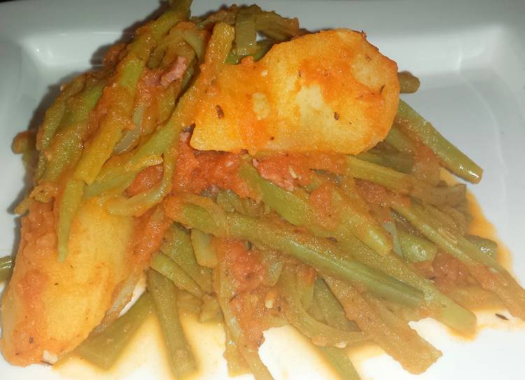 En una olla con agua hirviendo y 10 gr de sal por litro de agua echamos las patatas a cocer 5 minutos, a continuación en la misma olla las judías verdes que al estar en juliana se cocerán antes, no dejaremos cocer mas de 10-15 minutos. Cuando las tengamos escurridas se las incorporaremos a nuestra salsa de tomate y les daremos un hervor a todo el conjunto de unos 2-3 minutos.