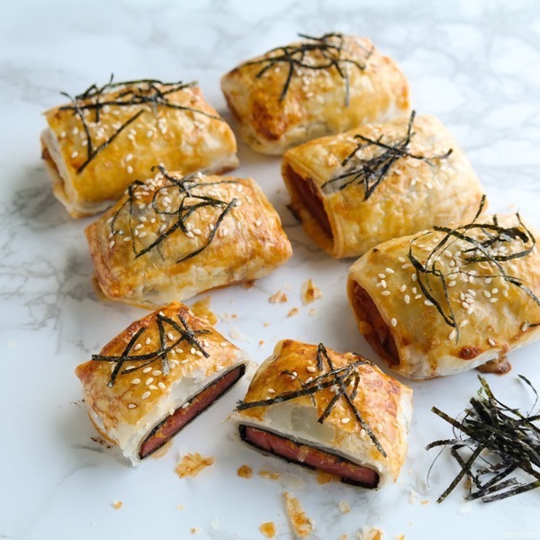 Cortamos la masa de hojaldre en 6 rectángulos. Con una hoja suelta de nori, envuelvemos la rebanada SPAM con 1 cucharadita de kimchi picado y enrollamos el hojaldre con fuerza alrededor sellándo los extremos suavemente con el dedo. Los llevamos a la bandeja de hornear y al horno unos 25 minutos.