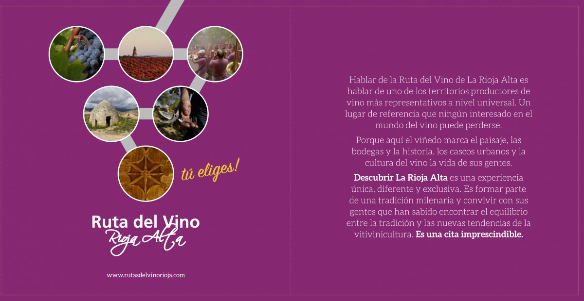 La Ruta del Vino de Rioja Alta presenta su nuevo folleto de enoturismo. Se ha editado un nuevo folleto de la Ruta del Vino de Rioja Alta. En está ocasión se ha optado por un modelo renovado en el cual además de una pequeña introducción se han incluido cuatro recorridos diferentes por varias localidades de la zona. El nuevo folleto cuenta además con un listado donde están incluidos todos los establecimientos adheridos a la Ruta del Vino de Rioja Alta.