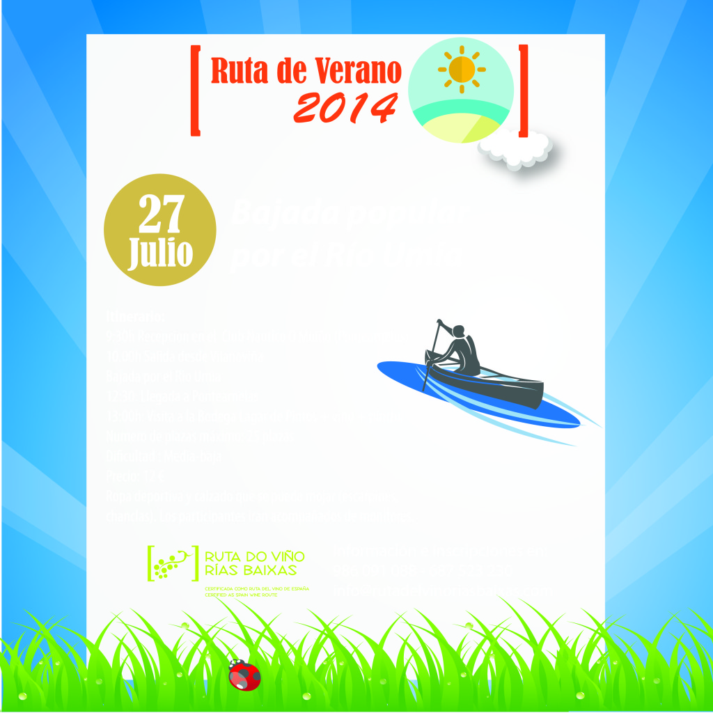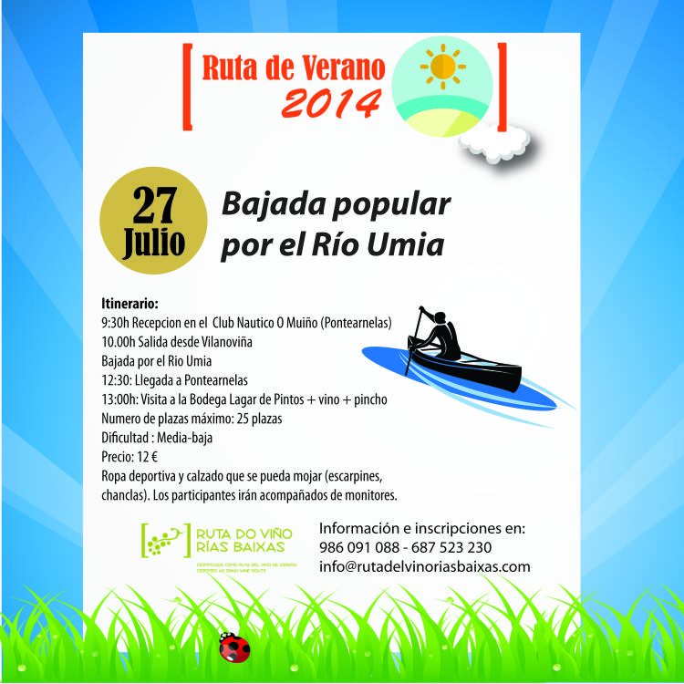 El domingo 27 de julio la Ruta do Viño Rías Baixas pone en marcha su primera actividad dentro de su programación de verano para que todos los interesados puedan seguir disfrutando del enoturismo durante la temporada estival. Así, por vez primera, la Ruta organiza un descenso popular por el río Umia con salida en el Club Náutico O Muíño y llegada hasta Pontearnelas. La jornada concluirá con una visita a la bodega Lagar de Pintos, que incluirá degustación de sus vinos y un pincho.