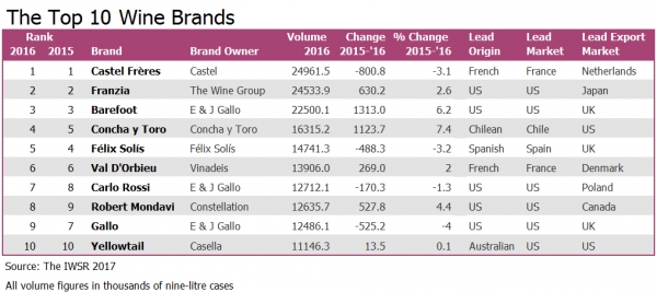 Las tres primeras marcas del ranking,Castel Frèrees (Fr), Franzia (USA) y Barefoot (USA), mantienen las mismas posiciones a cierre de 2015 que mantenían el año anterior. Destacable que conserva el primer puesto esta marca con una bajada de producción de un 3,1% con respecto al año anterior.